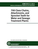 This Standard contains information on 700 Class cast iron, welded steel, stainless steel fabricated, and nonmetallic (plastic) chains, attachments and sprockets for water and sewage treatment plants. There are also Tables for (a) General chain dimensions, Ultimate strengths, Strand length, and Measuring load for checking chain length; minimum and maximum controlling dimensions for interchangeable chain links; (b) Chain clearance dimensions; (c) A42, F2, F22-6, F22-8, K2 and M1 attachments; (d) Pressure angle, Pitch diameter, and Clearance circle; (e) Maximum eccentricity and Face Run-out at root bottom diameter; and (f) Flange diameters for curved sidebar type chain.