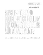 This Standard covers the dimensional limits required for chain interchangeability on sprockets. It does not provide for interconnectability of chains or individual links from different manufacturers. Hollow-pin chain, double pitch is a series of alternately assembled roller links and pin links in which the hollow pins articulate inside the bushings. The pitch of the link plates is twice that of the link plates of the base series chain. Pin link plates and roller link plates have identical straight-edge contours. Chains may have large rollers that are intended for use when the conveyed load is carried by the rollers. Hollow-pin chain, single-pitch is a series of alternately assembled roller links and pin links in which the hollow pins articulate inside the bushings. The main topics are (a) Hollow pin chains; and (b) Sprockets. There is a Table on General chain dimensions, Limiting dimensions for interchangeability, Measuring loads and Ultimate tensile strengths.