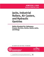 Volume B30.1 includes provisions that apply to the construction, operation, inspection, testing, and maintenance of mechanical ratchet jacks, hand- or power-operated mechanical screw jacks, hand- or power-operated hydraulic jacks, air lifting bags, industrial rollers, air casters, and telescopic hydraulic gantry systems.