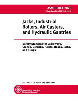 Volume B30.1 includes provisions that apply to the construction, operation, inspection, testing, and maintenance of mechanical ratchet jacks, hand- or power-operated mechanical screw jacks, hand- or power-operated hydraulic jacks, air lifting bags, industrial rollers, air casters, telescopic hydraulic gantry systems, and strand jacks