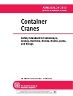 Volume B30.24 includes provisions that apply to theconstruction, installation, operation, inspection, testing,and maintenance of container cranes used for liftingpurposes, in conjunction with equipment described inother volumes of the B30 Standard. This Volumeincludes power-operated cranes of the above type whosepower source is either self-contained or provided externally;single, double, or box girder construction, utilizinga trolley and a container-handling spreader or otherapplicable lifting apparatus (cargo hook, cargo beam,magnet, etc.); and rail- or rubber tire-mounted withthrough-the-legs or between-the-legs operation. Use ofthe same hardware for purposes other than lifting isexcluded from the provisions of this Volume. ThisVolume does not apply to small industrial truck-typecranes, container-handling toploaders and sideloaders,or mobile straddle-type industrial lifts.