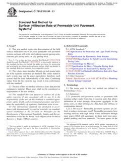 1.1”This test method covers the determination of the field surface infiltration rate of in place permeable unit pavement systems surfaced with solid interlocking concrete paving units, concrete grid paving units, or clay paving brick.