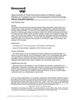 This method is for determining trace permanent gases in high purity polymer grade ethylene and propylene gas or liquid using a gas chromatograph (GC) equipped with a pulsed discharge helium ionization detector (PDHID). The instrument is preconfigured and capable of determining typical impurities in polymer grade ethylene or propylene, however this method only describes the procedure for measuring carbon dioxide, carbon monoxide, hydrogen, nitrogen, and a composite of oxygen and argon. The instrument uses multiple columns and timed valve switching to eliminate the interference of propylene with the permanent gases. The lower limit of quantitation for nitrogen is 0.05 mol-ppm, carbon monoxide is 0.15 mol-ppm, carbon dioxide is 0.16 mol-ppm, oxygen is 0.25 mol-ppm, and hydrogen is 0.37 mol-ppm.