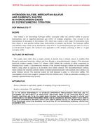 This method is for determining hydrogen sulfide, mercaptan sulfur and carbonyl sulfide in gaseous hydrocarbons and in liquefied petroleum gas (LPG) of ordinary properties. Also covered is the determination of mercaptan in non-ordinary LPG which may contain a wide range of hydrocarbon types from ethane to such gasoline boiling range hydrocarbons as pentane and hexane. The hydrogen sulfide concentration range which can be determined is from 0.03 to several thousand grains per 100 cu ft (0.3 to several thousand wt-ppm). The method is also applicable to LPG samples containing as little as 1.0 ppm mercaptan sulfur.